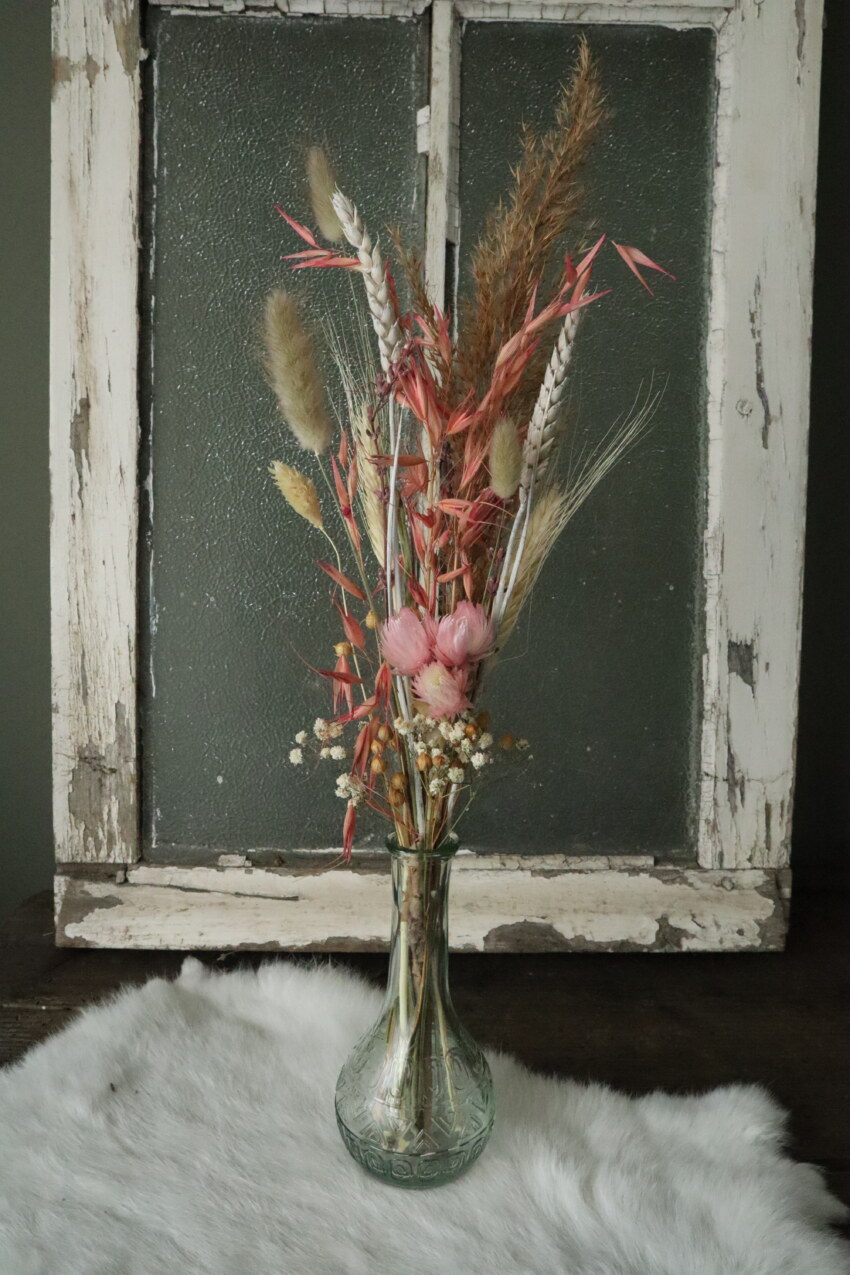 Het vaasje is gevuld met droogbloemen in de tinten beige, wit en roze.
